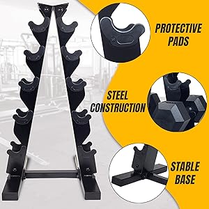 | • | The rack is made of steel with a powder-coated finish for durability, and its vertical design allows easy access to dumbbells while taking up little floor space |