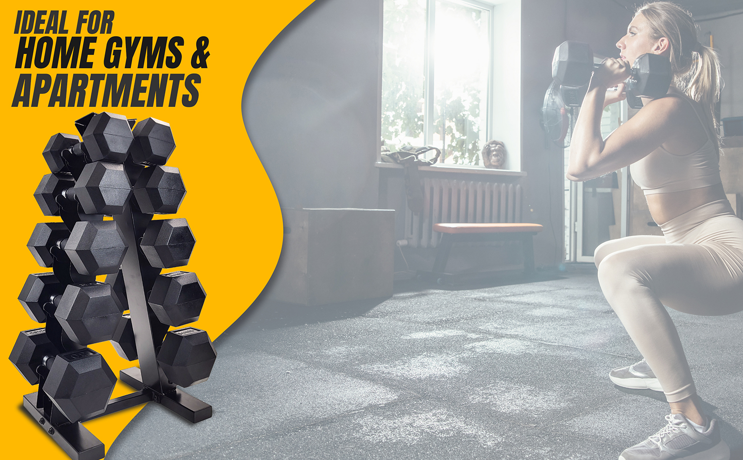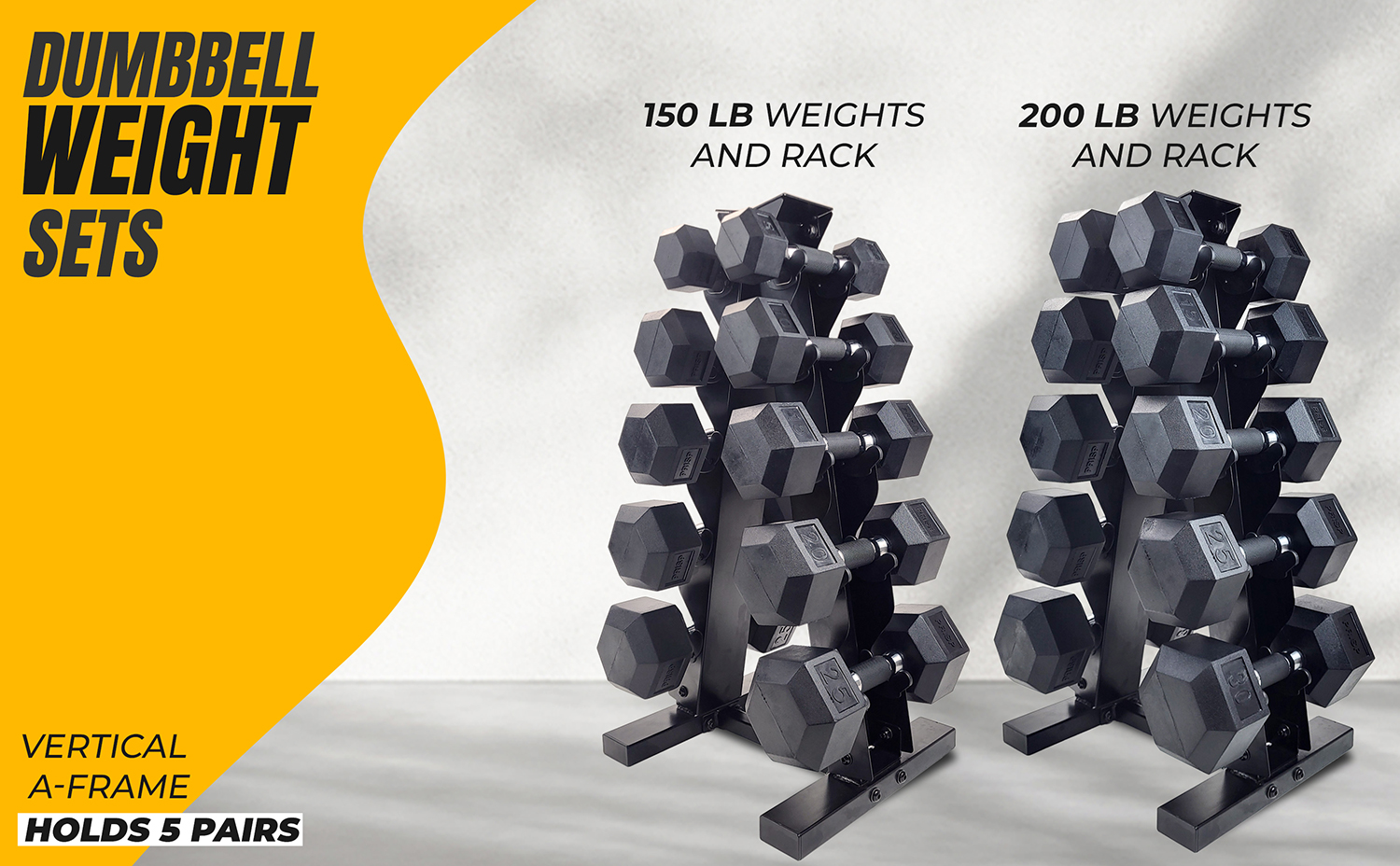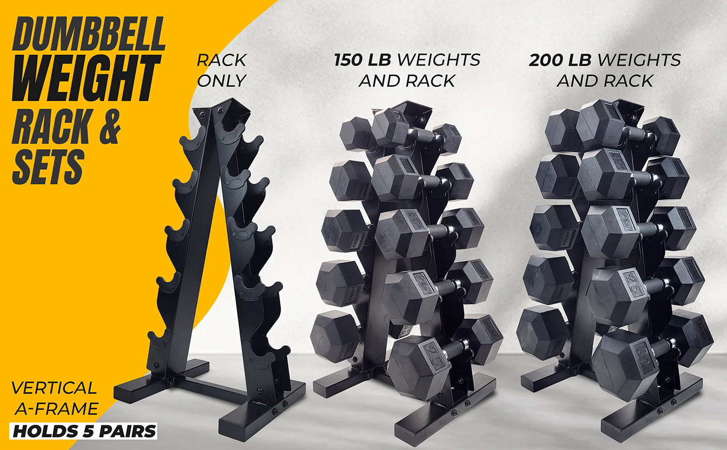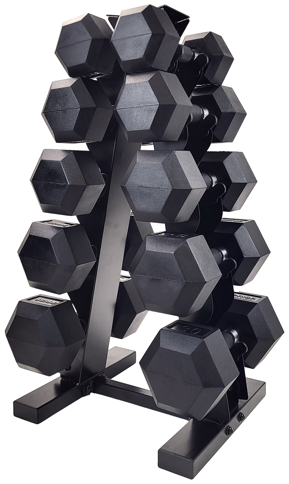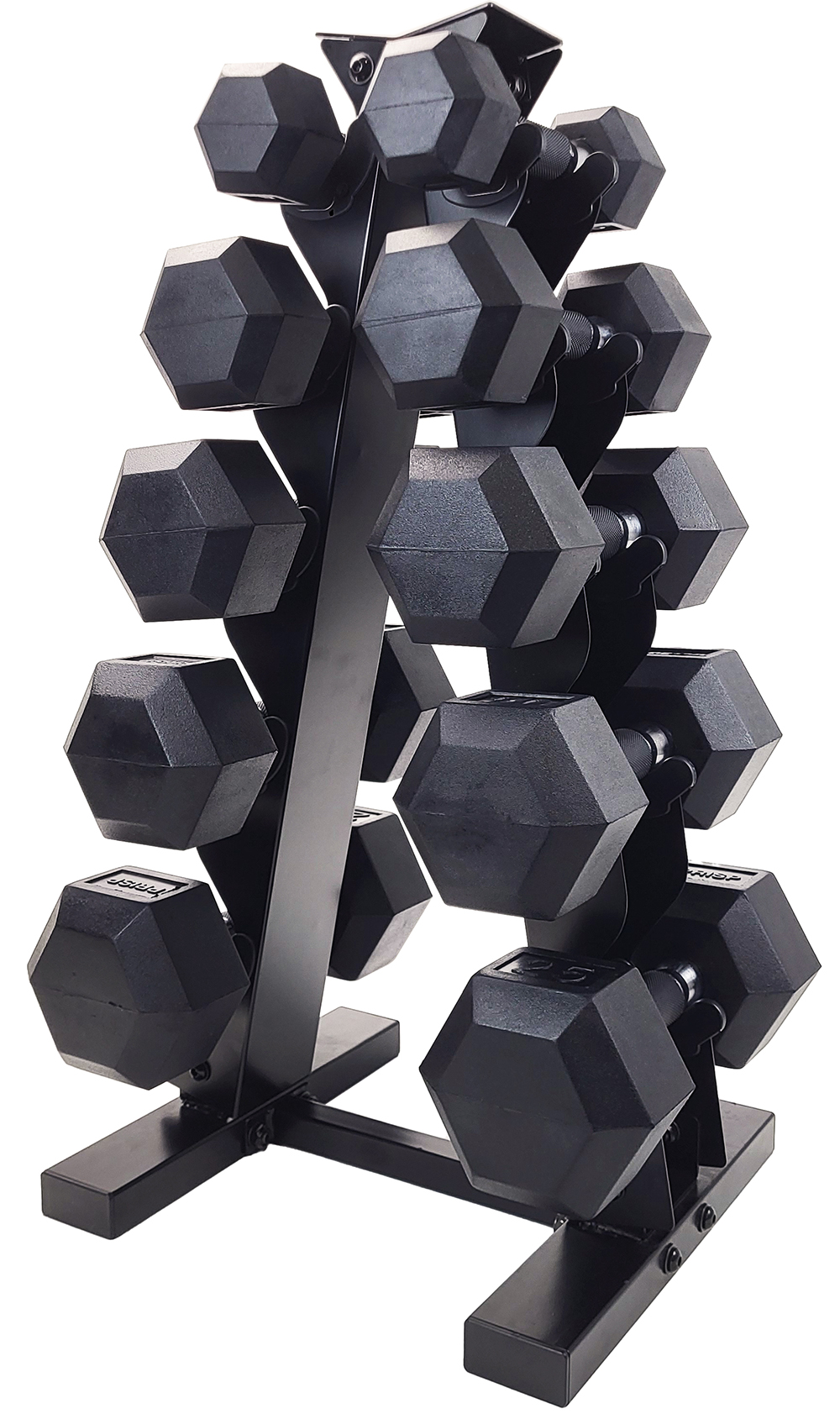 | • | These weight set includes a heavy-duty vertical A-frame rack and 5 pairs of hex dumbbells |