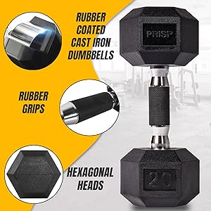 PRISP Rubber Encased Hex Dumbbell with Rack - 150 lb
