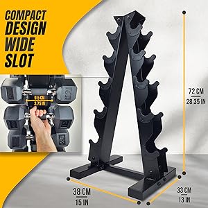 The PRISP Dumbbell Rack and Dumbbell Sets offer a smart, space-saving solution to keep your home gym organized and efficient. Designed in a vertical A-frame shape, the sturdy steel rack can hold up to five pairs of hex dumbbells and features a durable powder-coated finish that resists wear and ensures long-lasting performance. Its compact design maximizes floor space while providing easy access to your weights during any workout.